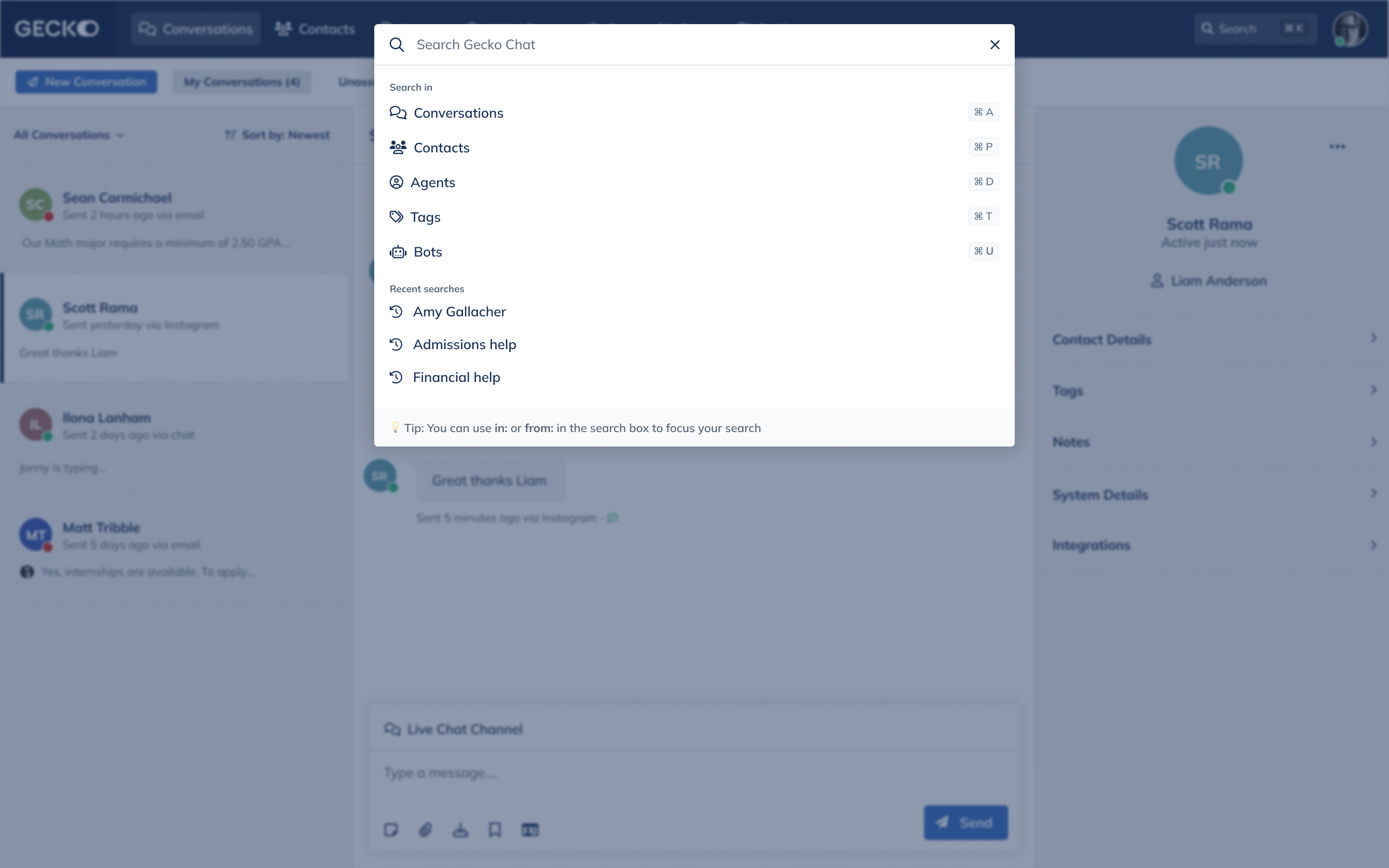 A more robust searching experience. This included the ability to pre-filter your search results, for example you could search within Conversations and specifically search within Channels or from certain individuals. We will also surface recent or frequent searches to the user. I also love the randomised tips suggested to the user 😍.